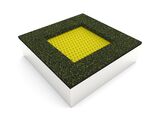 Keret - kiváló minőségű horganyzott acélból készült, amely ellenáll a korróziónak. A keret felső része alatt rejtőznek a rugók, amelyeket a tompító felület takar. A keret többi része a földbe van helyezve.