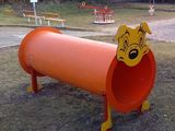 A kutya feje és lába kiváló minőségű HDPE műanyagból készül (nagy sűrűségű teljesen festett polietilén) készülnek, melyet nagyfokú színállandóság, UV-álló képesség és főleg biztonság jellemez, mivel nem törékeny, és ezáltal a gyerekeket nem fenyegeti az éles letörött részek általi sérülés veszélye. A mászóalagutak üveggyapot készülnek, melyeket UV-állóság és nagyfokú színállóság jellemez. Az összekötőelemek horganyzottak vagy rozsdamentes acélból készülnek.