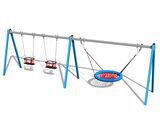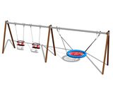 A hinta horganyzott láncok segítségével van felakasztva a fém rúdra. A "Fészek" típusú ülőkét nagy szilárdságú szálakból készült polipropilén kötélből gyártjuk. A felfüggesztő kötelek HERKULES anyagból (16 mm-es polipropilén kötél belső acélmaggal). Az baby ülőke gumiból készül, és alumínium betétet tartalmaz. Az összekötőelemek horganyzottak vagy rozsdamentes acélból készülnek.