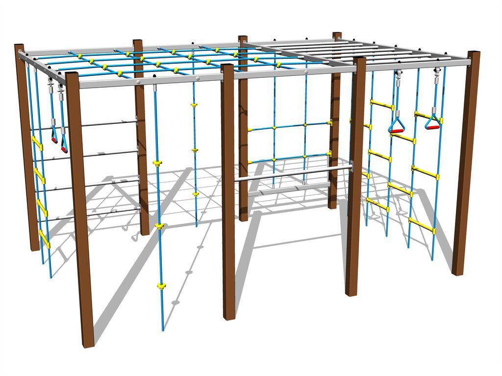 Mászókötél, 2x kötél hintagyűrűk, mászóháló, 2x kötéllétra, létrefokok, trapéz, kapaszkodóháló.