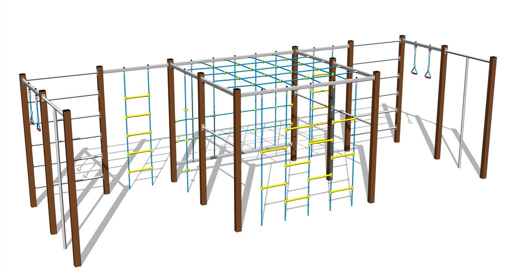 2x mászókötél, 2x mászórúd, mászóháló, kötéllétra, létrefokok, mászófal.