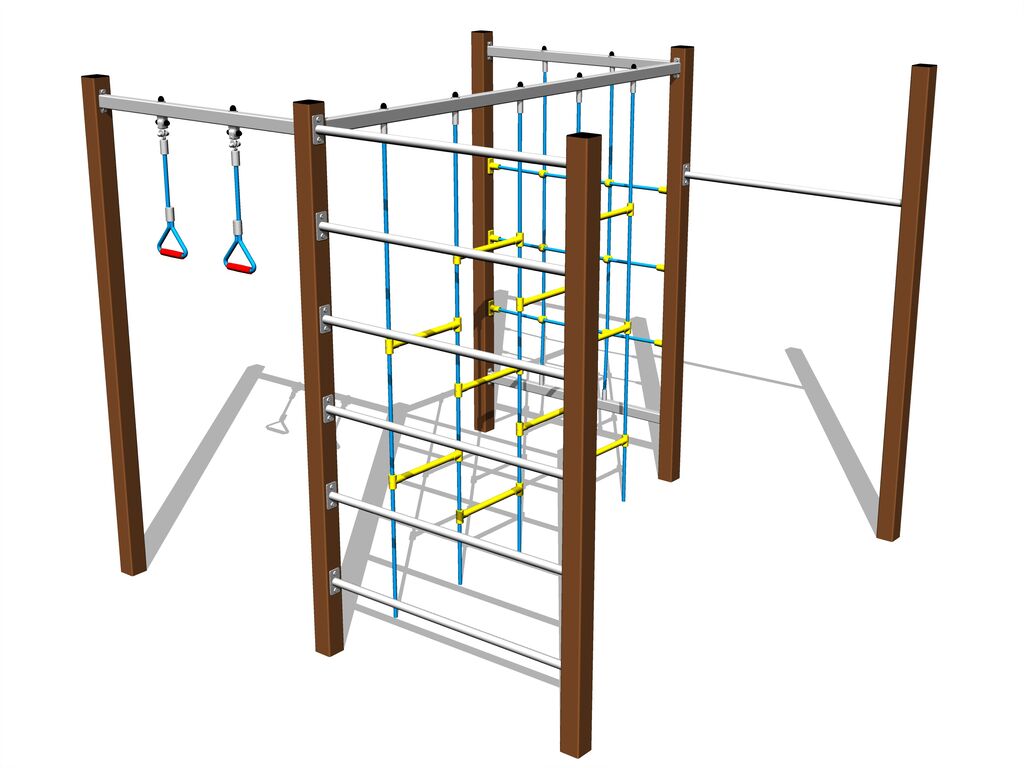 Mászórúd, mászóháló, létrefokok, mászófal, kötél hintagyűrűk, trapéz.