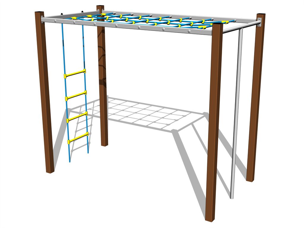 Mászórúd, mászóháló, létrefokok, mászófal, kötél hintagyűrűk.