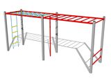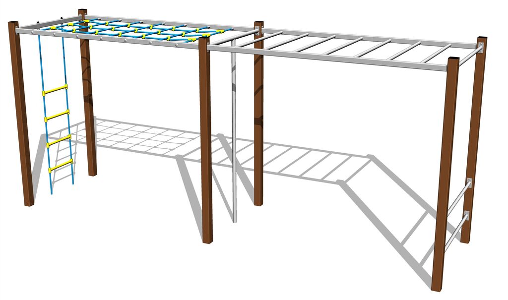 Mászórúd, mászóháló, létrefokok, mászófal, kötél hintagyűrűk, trapéz.