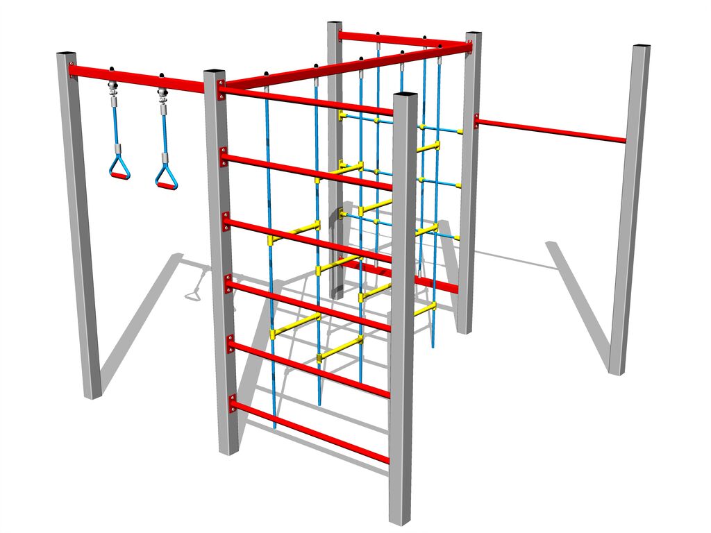 Mászórúd, mászóháló, létrefokok, mászófal, kötél hintagyűrűk, trapéz.
