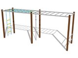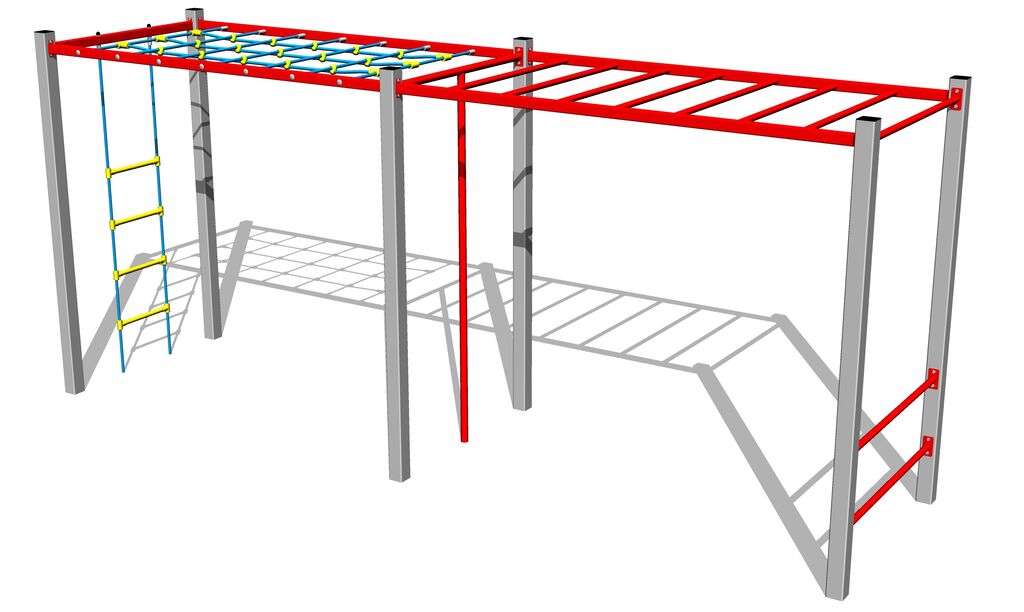 Mászórúd, mászóháló, létrefokok, mászófal, kötél hintagyűrűk, trapéz.