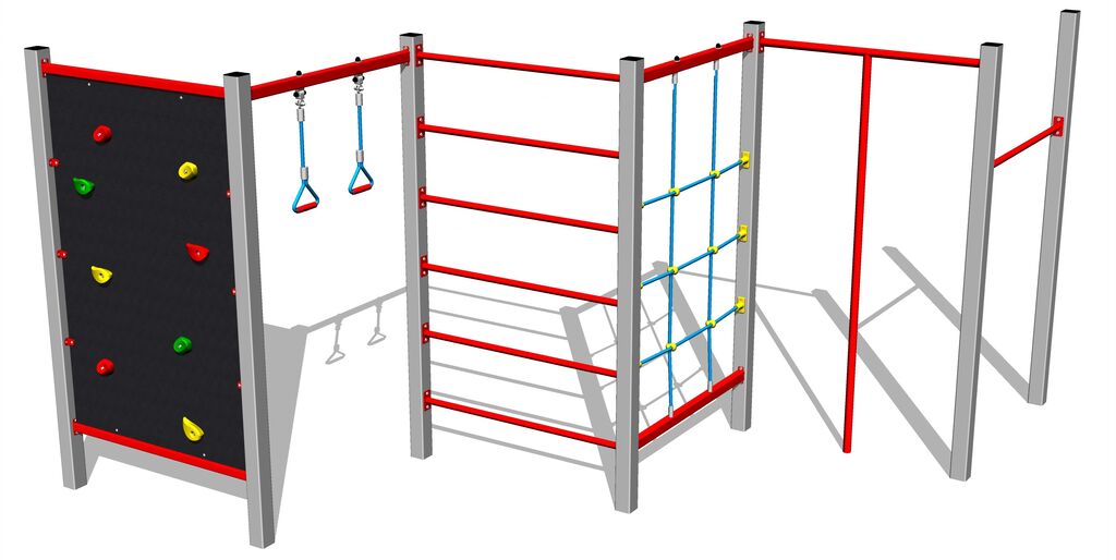 Mászórúd, mászóháló, létrefokok, mászófal, kötél hintagyűrűk, trapéz. Több információ