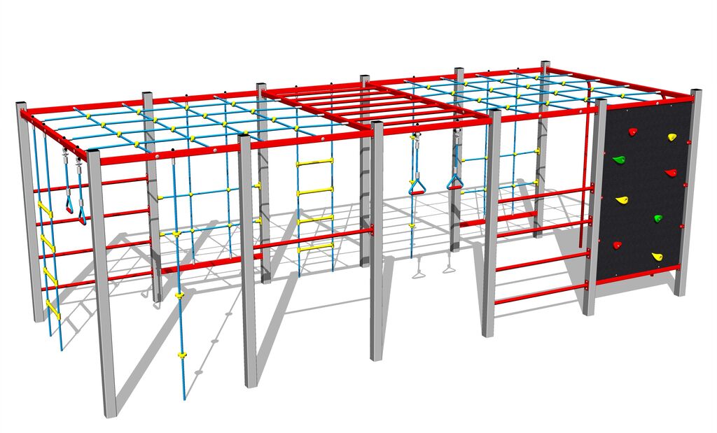 A mászóháló, nyújtóháló, mászókötél és kötéllétra HERKULES anyagból (16 mm-es polipropilén kötél belső acélmaggal) készül. A kötéllétra és a mászóháló esetében a kötelek műanyag kapcsokkal vannak összekapcsolva. A mászófal HPL készült (Nagynyomású laminátum készül, melyet nagyfokú színállandóság, karcolásokkal szembeni ellenálló képesség, UV-álló képesség és vízállóság). A hegymászó markolatok kvarchomokból és poliészter készülnek - ez hosszú élettartamot, színállóságot és a kézbőrrel szemben kímélő felület biztosít. Az összekötőelemek horganyzottak vagy rozsdamentes acélból készülnek.