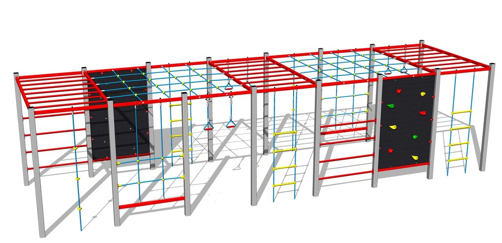 A mászóháló, nyújtóháló, mászókötél és kötéllétra HERKULES anyagból (16 mm-es polipropilén kötél belső acélmaggal) készül. A kötéllétra és a mászóháló esetében a kötelek műanyag kapcsokkal vannak összekapcsolva. A mászófal HPL készült (Nagynyomású laminátum készül, melyet nagyfokú színállandóság, karcolásokkal szembeni ellenálló képesség, UV-álló képesség és vízállóság). A hegymászó markolatok kvarchomokból és poliészter készülnek - ez hosszú élettartamot, színállóságot és a kézbőrrel szemben kímélő felület biztosít. Az összekötőelemek horganyzottak vagy rozsdamentes acélból készülnek.