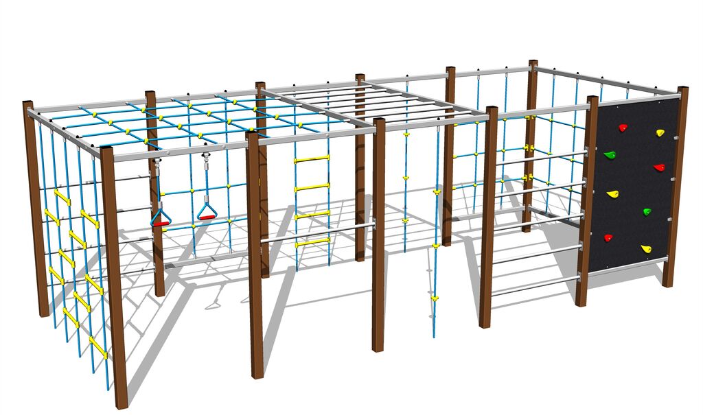 A mászóháló, nyújtóháló, mászókötél és kötéllétra HERKULES anyagból (16 mm-es polipropilén kötél belső acélmaggal) készül. A kötéllétra és a mászóháló esetében a kötelek műanyag kapcsokkal vannak összekapcsolva. A mászófal HPL készült (Nagynyomású laminátum készül, melyet nagyfokú színállandóság, karcolásokkal szembeni ellenálló képesség, UV-álló képesség és vízállóság). A hegymászó markolatok kvarchomokból és poliészter készülnek - ez hosszú élettartamot, színállóságot és a kézbőrrel szemben kímélő felület biztosít. Az összekötőelemek horganyzottak vagy rozsdamentes acélból készülnek.