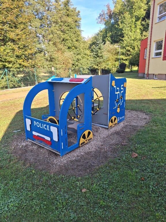 Rendőrautó PP101K - teljes fémszerkezet - 1 amely biztosítja a magas színstabilitást. Esési magasság 1 m-re, mivel az ütközési terület elegendő a gyephez. Több információ
