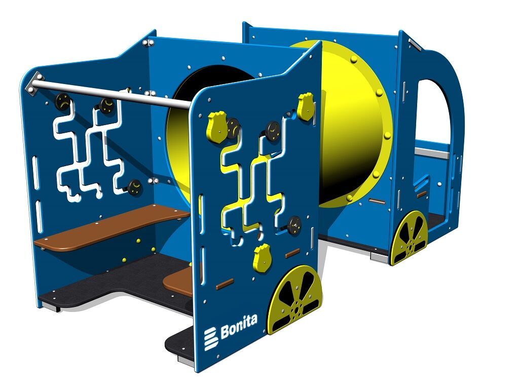 Az összes többi alkatrész kiváló minőségű műanyag HDPE-ből készül (nagynyomású, színes színű polietilén, amelyet magas színállósággal, UV-állóképességgel és elsősorban a biztonsággal jellemeznek, mert nem törhető, és nem áll fenn a gyermekek éles sérülésének veszélye.) fragmensek). A mászóalagutak polietilénből készül, amely UV-stabil és magas színstabilitással jellemezhető. Az összekötőelemek horganyzottak vagy rozsdamentes acélból készülnek.