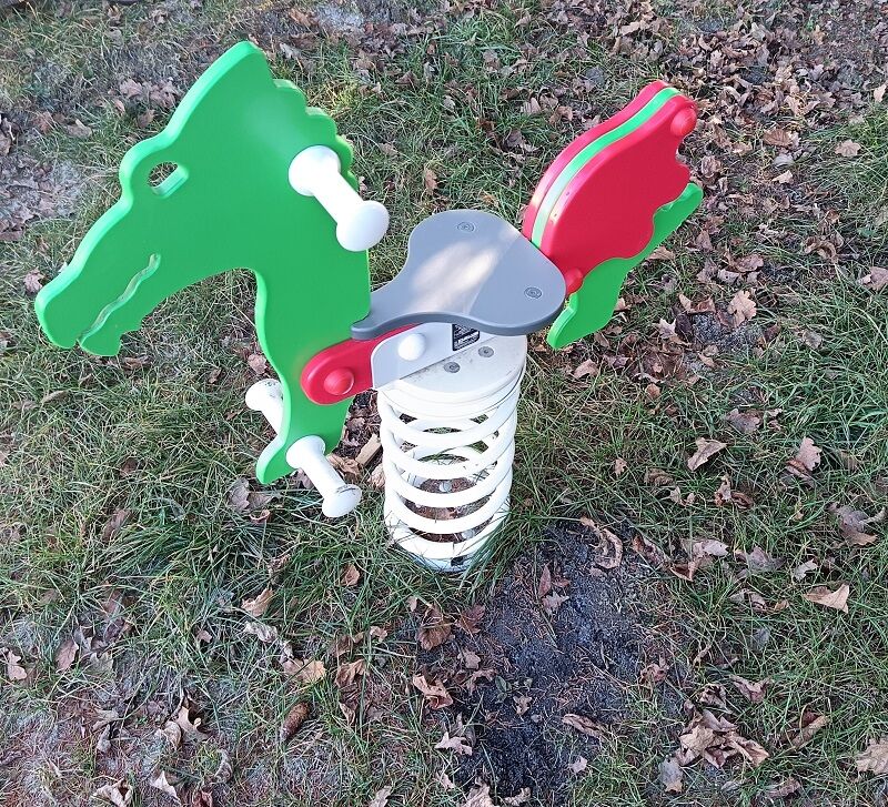 Rugós hinta – SÁRKÁNY. Esésmagasság 1 m-ig, ütéscsillapító felületként elegendő a gyep. Több információ