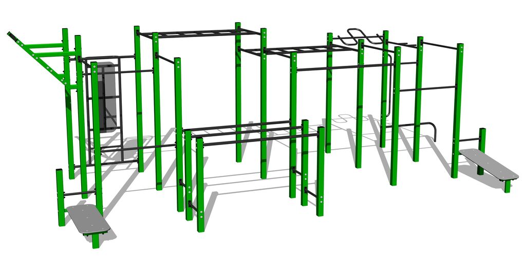 A workout elemek tartószerkezete szerkezeti acélból készül, melyet a korrózióval szemben horganyzott felületkezeléssel látnak el, ezáltal jelentősen meghosszabbítják a játékelem élettartamát vagy duplex rétegű égetett porfesték védi az RAL szabvány szerint. Minden további fém elem, pl.: markolat, korlát, stb. szintén horganyzással vagy duplex rétegű égetett porfesték védi az RAL szabvány szerint, a megrendelő külön kérésére az adott elemek rozsdamentes kivitelben is gyárthatók. A padok és fellépők rendkívül jó minőségű HDPE műanyagból (nagy sűrűségű teljesen festett polietilén) készülnek, melyet nagyfokú színállandóság, UV-álló képesség és főleg biztonság jellemez, mivel nem törékeny, és ezáltal a gyerekeket nem fenyegeti az éles letörött részek általi sérülés veszélye. Az összekötőelemek horganyzottak vagy rozsdamentes acélból készülnek.