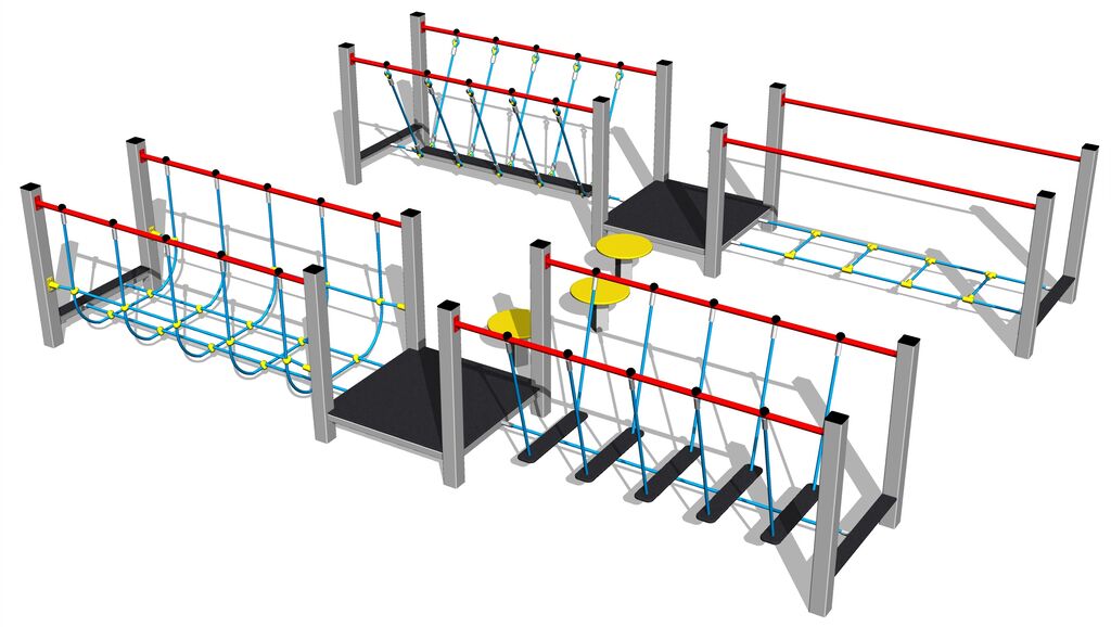 A kötelek HERKULES anyagból (16 mm-es polipropilén kötél belső acélmaggal). Az összes többi fémelem horganyzással vagy duplex rétegű égetett porfesték védi az RAL szabvány szerint. Az emelvények HPL készült (Nagynyomású laminátum készül, melyet nagyfokú színállandóság, karcolásokkal szembeni ellenálló képesség és vízállóság). A lépegetők lapja rendkívül jó minőségű HPL (Nagynyomású laminátum készül, melyet nagyfokú színállandóság, karcolásokkal szembeni ellenálló képesség és vízállóság). A lépegetők lapja rendkívül jó minőségű HDPE műanyagból (nagy sűrűségű teljesen festett polietilénből készülnek, melyet nagyfokú színállandóság, UV-álló képesség és főleg biztonság jellemez, mivel nem törékeny, és ezáltal a gyerekeket nem fenyegeti az éles letörött részek általi sérülés veszélye). Az összekötőelemek horganyzottak vagy rozsdamentes acélból készülnek.