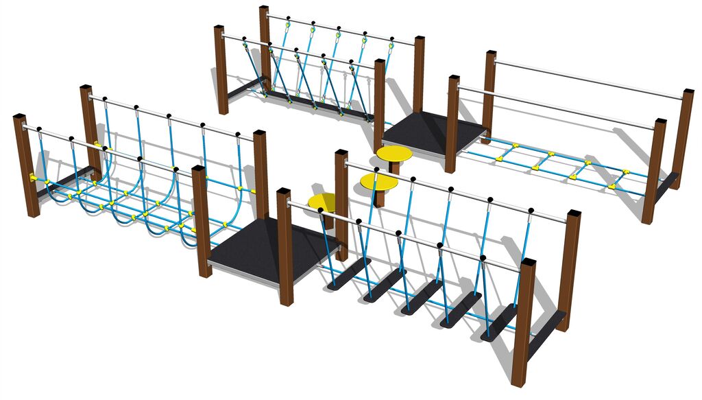 A kötelek HERKULES anyagból (16 mm-es polipropilén kötél belső acélmaggal). Az összes többi fémelem horganyzással vagy duplex rétegű égetett porfesték védi az RAL szabvány szerint. Az emelvények HPL készült (Nagynyomású laminátum készül, melyet nagyfokú színállandóság, karcolásokkal szembeni ellenálló képesség és vízállóság). A lépegetők lapja rendkívül jó minőségű HPL (Nagynyomású laminátum készül, melyet nagyfokú színállandóság, karcolásokkal szembeni ellenálló képesség és vízállóság). A lépegetők lapja rendkívül jó minőségű HDPE műanyagból (nagy sűrűségű teljesen festett polietilénből készülnek, melyet nagyfokú színállandóság, UV-álló képesség és főleg biztonság jellemez, mivel nem törékeny, és ezáltal a gyerekeket nem fenyegeti az éles letörött részek általi sérülés veszélye). Az összekötőelemek horganyzottak vagy rozsdamentes acélból készülnek.