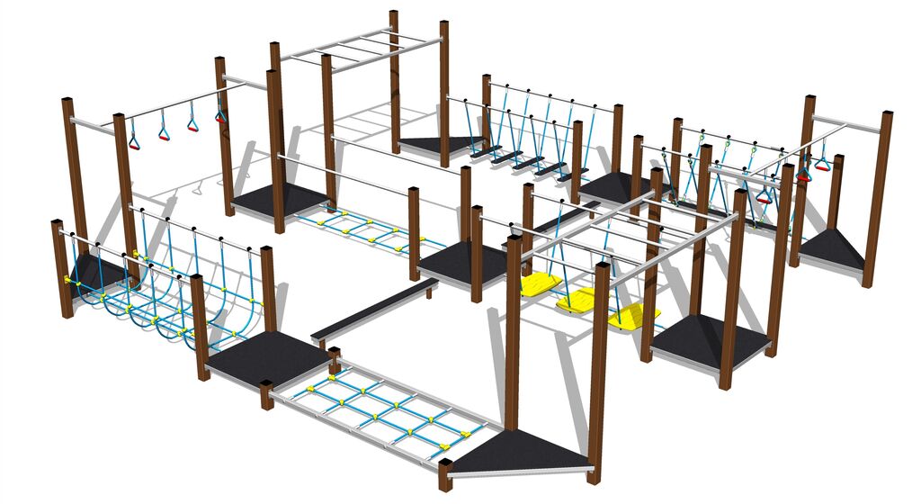 A kötelek HERKULES anyagból (16 mm-es polipropilén kötél belső acélmaggal). Az összes többi fémelem horganyzással vagy duplex rétegű égetett porfesték védi az RAL szabvány szerint. Az emelvények HPL készült (Nagynyomású laminátum készül, melyet nagyfokú színállandóság, karcolásokkal szembeni ellenálló képesség és vízállóság). A lépegetők lapja rendkívül jó minőségű HPL (Nagynyomású laminátum készül, melyet nagyfokú színállandóság, karcolásokkal szembeni ellenálló képesség és vízállóság). Az összekötőelemek horganyzottak vagy rozsdamentes acélból készülnek.