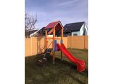Négyoldalú torony, A-alakú tető, ferde mászóka kötéllel és lépcsőkkel, csúszda, ferde mászóháló, ferde mászóka lépcsőkkel és fém fogantyúkkal. Több információ