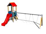 Az ülés és a lengőkarok nem tartoznak a lengéshez. Szükséges a megvásárolható ülőhely (2 db) és a csuklópántok (4 db). Négyoldalú torony, A-alakú tető, ferde mászóka lépcsőkkel és fém fogantyúkkal, csúszda, 2x gát, fém gerenda. Több információ