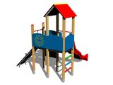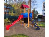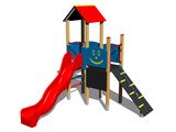 2x négyoldalú torony, A-alakú tető, ferde mászóka kötéllel és lépcsőkkel, rajztábla a tornyon, csúszda, golyós számoló a torony alatt, 4x gát HDPE. Több információ