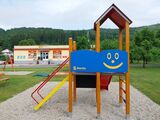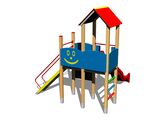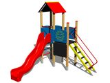 2x négyoldalú torony, A-alakú tető, ferde mászóka lépcsőkkel és fém fogantyúkkal, rajztábla a tornyon, csúszda, golyós számoló a torony alatt, 4x gát HDPE.
