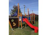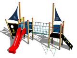 2x Négyoldalú torony, Fémkorlát fakeretbe ültetve, csúszda, kötélhíd, ferde mászóháló, ferde mászóka kötéllel és lépcsőkkel, rajztábla, 2x zászló, sisak, 2x gát HDPE. Több információ