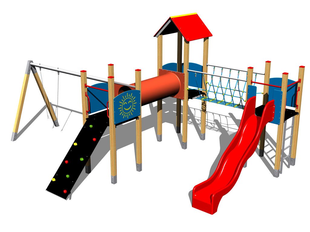 3x Négyoldalú torony, A-alakú tető, csúszda, függőleges létra, kötélhíd, átmászó alagút a tornyok között, ferde mászófal, 5x gát HDPE, láncos hinta. Több információ