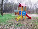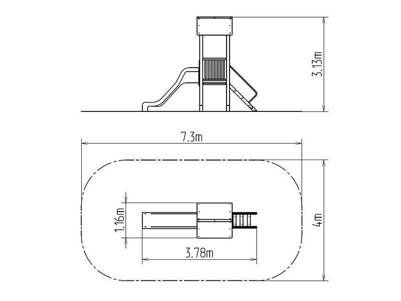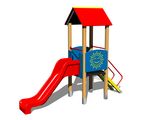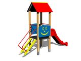 Négyoldalú torony, A-alakú tető, ferde mászóka lépcsőkkel és fém fogantyúkkal, csúszda, 2x gát. Több információ