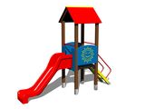 Négyoldalú torony, A-alakú tető, ferde mászóka lépcsőkkel és fém fogantyúkkal, csúszda, 2x gát. Több információ