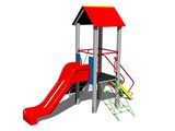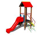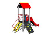 Négyoldalú torony, A-alakú tető, ferde mászóka kötéllel és lépcsőkkel, csúszda, ferde mászóháló, ferde mászóka lépcsőkkel és fém fogantyúkkal. Több információ