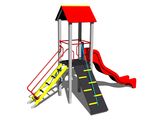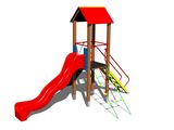 Négyoldalú torony, A-alakú tető, ferde mászóka kötéllel és lépcsőkkel, csúszda, ferde mászóháló, ferde mászóka lépcsőkkel és fém fogantyúkkal. Több információ