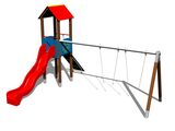 Az ülés és a lengőkarok nem tartoznak a lengéshez. Szükséges a megvásárolható ülőhely (2 db) és a csuklópántok (4 db). Négyoldalú torony, A-alakú tető, ferde mászóka kötéllel és lépcsőkkel, csúszda, 2x gát, láncos dupla hinta. Több információ
