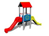 Négyoldalú torony, A-alakú tető, 2x csúszda, ferde mászóka kötéllel és lépcsőkkel, gát. Több információ