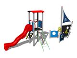 Négyoldalú torony, domború tető, csúszda, ferde mászóháló, gát, ferde mászóka lépcsőkkel és fém fogantyúkkal, rajztábla, zászló, sisak, 2x gát lőrés. Több információ