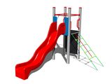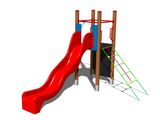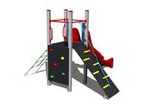 Négyoldalú torony, ferde mászóka kötéllel és lépcsőkkel, függőleges mászófal a tornyon, ferde mászóháló, csúszda. Több információ