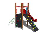 Négyoldalú torony, ferde mászóka kötéllel és lépcsőkkel, függőleges mászófal a tornyon, ferde mászóháló, csúszda. Több információ