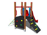 Négyoldalú torony, ferde mászóka kötéllel és lépcsőkkel, függőleges mászófal a tornyon, ferde mászóháló, csúszda. Több információ