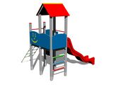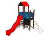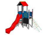 2x négyoldalú torony, A-alakú tető, ferde mászóháló, rajztábla a tornyon, csúszda, golyós számoló a torony alatt, 4x gát HDPE. Több információ