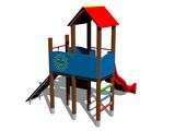 2x négyoldalú torony, A-alakú tető, ferde mászóka kötéllel és lépcsőkkel, rajztábla a tornyon, csúszda, golyós számoló a torony alatt, 4x gát HDPE. Több információ