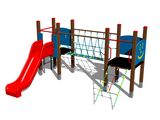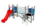 2x négyoldalú torony, függőleges létra, kötélhíd, csúszda, ferde mászóháló, 3x gát HDPE. Több információ