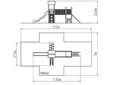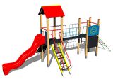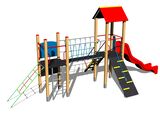 2x Négyoldalú torony, A-alakú tető, csúszda, híd kötélkorláttal, ferde mászóka lépcsőkkel és fém fogantyúkkal, ferde mászóka kötéllel és lépcsőkkel, függőleges létra, rajztábla a tornyon, ferde mászóháló, gát. Több információ