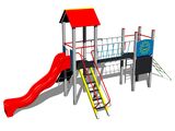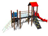 2x Négyoldalú torony, A-alakú tető, csúszda, híd kötélkorláttal, ferde mászóka lépcsőkkel és fém fogantyúkkal, ferde mászóka kötéllel és lépcsőkkel, függőleges létra, rajztábla a tornyon, ferde mászóháló, gát. Több információ