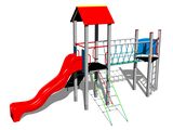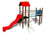 Háromoldalú torony, Négyoldalú torony, A-alakú tető, függőleges létra, kötélhíd, csúszda, ferde mászóháló, gát HDPE. Több információ