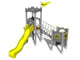 2x Négyoldalú torony, csúszda, ferde mászóháló, 3x gát HDPE, kötélhíd, függőleges mászófal a tornyon, zászló, pártázatos oromzat HDPE. Több információ