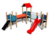 3x Négyoldalú torony, A-alakú tető, csúszda, függőleges létra, kötélhíd, átmászó alagút a tornyok között, ferde mászófal, 5x gát HDPE. Több információ