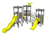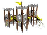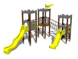 3x Négyoldalú torony, 2x csúszda, ferde mászóháló, 4x gát HDPE, kötélhíd, függőleges mászófal a tornyon, zászló, 3x pártázatos oromzat HDPE, kötélhíd lépcsővel. Több információ