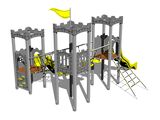 3x Négyoldalú torony, 2x csúszda, ferde mászóháló, 4x gát HDPE, kötélhíd, függőleges mászófal a tornyon, zászló, 3x pártázatos oromzat HDPE, kötélhíd lépcsővel. Több információ