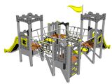 4x Négyoldalú torony, 2x csúszda, ferde mászóháló, 4x gát HDPE, 2x kötélhíd, függőleges mászófal a tornyon, zászló, 2x pártázatos oromzat HDPE, 2x kötélhíd lépcsővel. Több információ