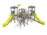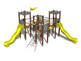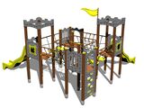 4x Négyoldalú torony, 2x csúszda, ferde mászóháló, 4x gát HDPE, 2x kötélhíd, függőleges mászófal a tornyon, zászló, 2x pártázatos oromzat HDPE, 2x kötélhíd lépcsővel. Több információ