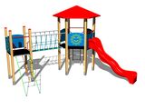 Négyoldalú torony, Hatoldalú torony, tető, csúszda, függőleges létra, kötélhíd, ferde mászóháló, 5x gát HDPE. Több információ